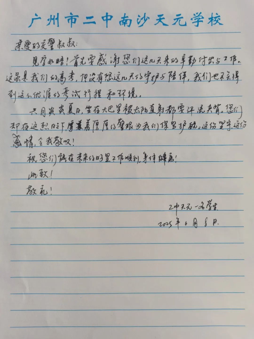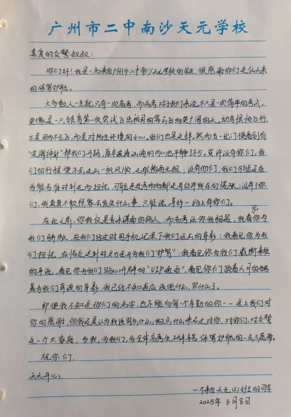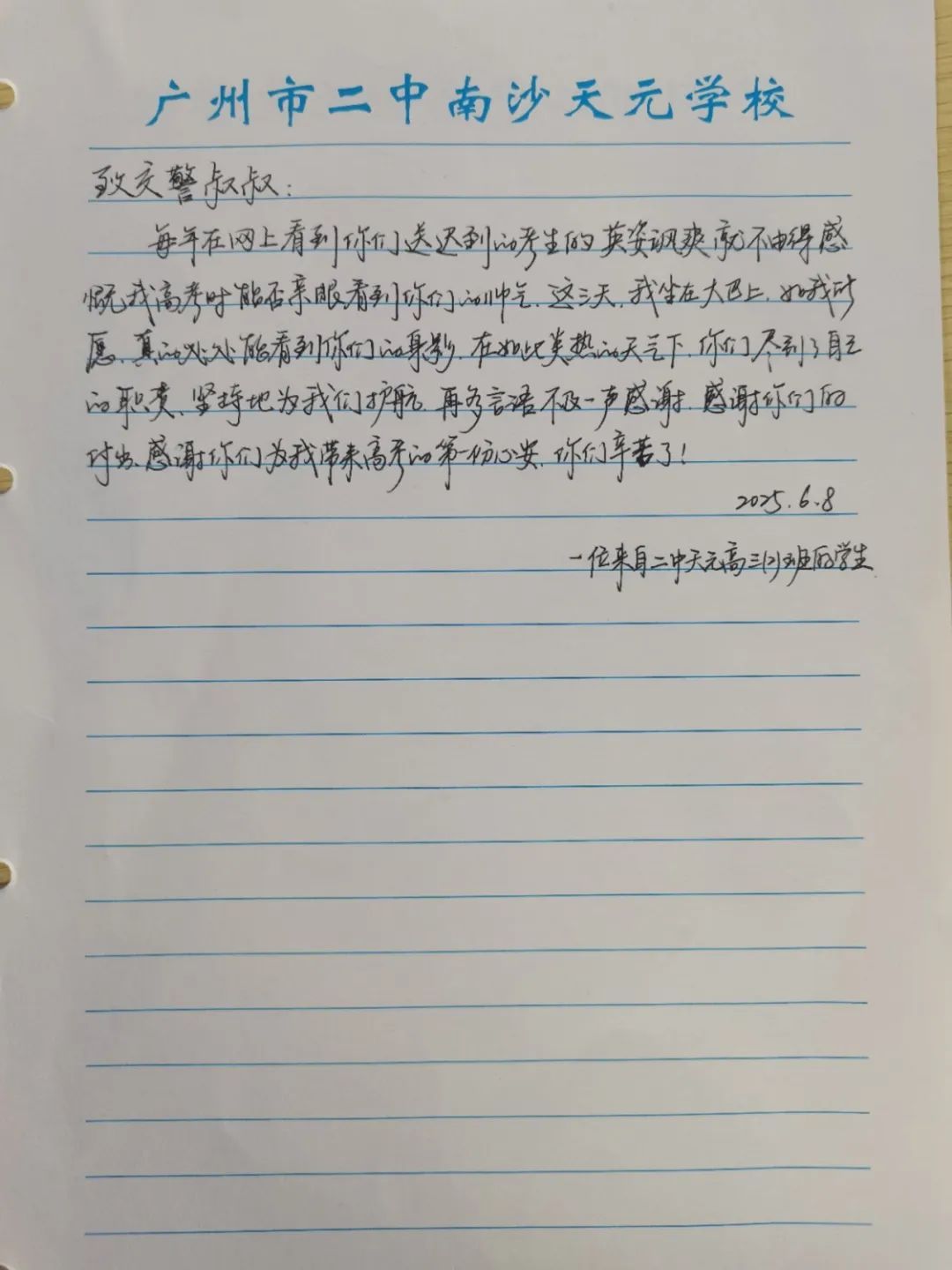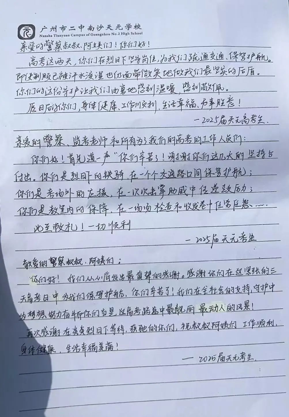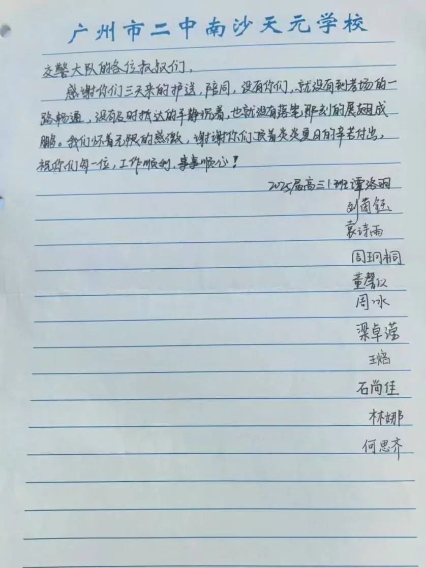6月9日上午,2025年高考最后一天,送考大巴在广州南沙公安护航下顺利到达广州市南沙区各个考点后,现场执勤民辅警接连收到来自广州市二中南沙天元学校、广州市外国语学校、南沙麒麟中学及广大附中南沙实验学校送来的共5封学校感谢信、100余封学生感谢信。薄薄的信纸上,是或娟秀,或洒脱,或工整,或刚劲的字迹,或长或短地书写着考生们这几天的所见所感。