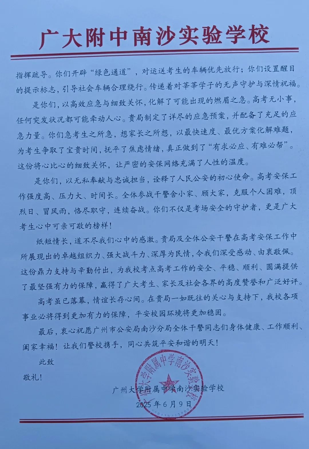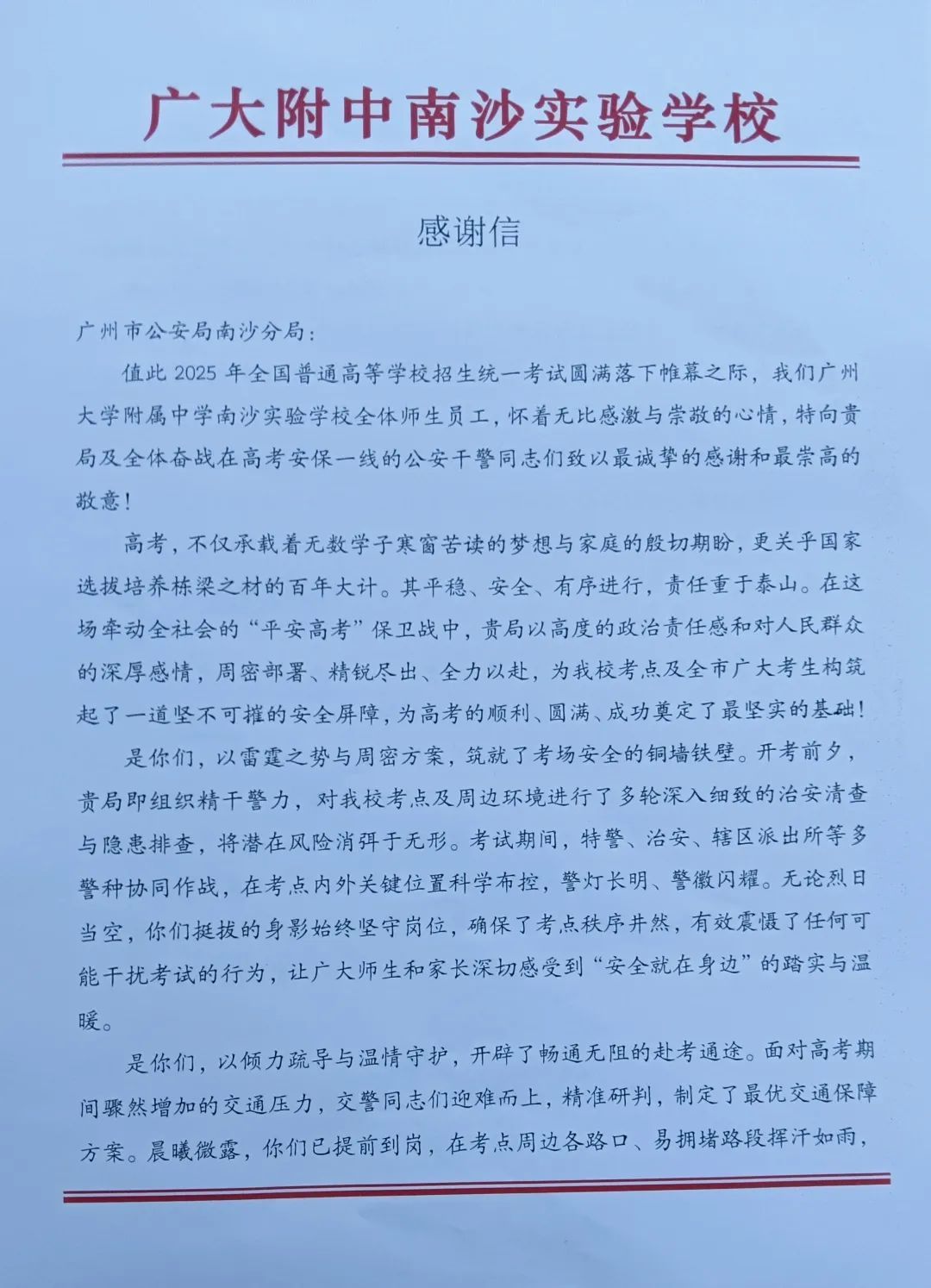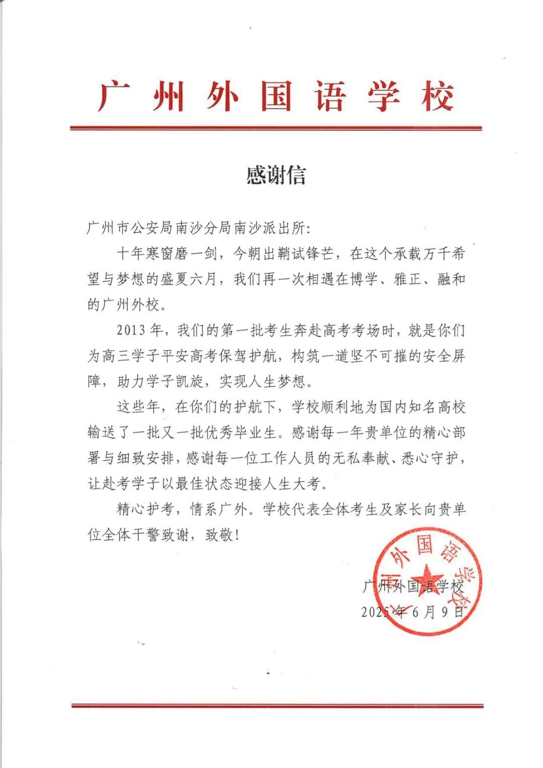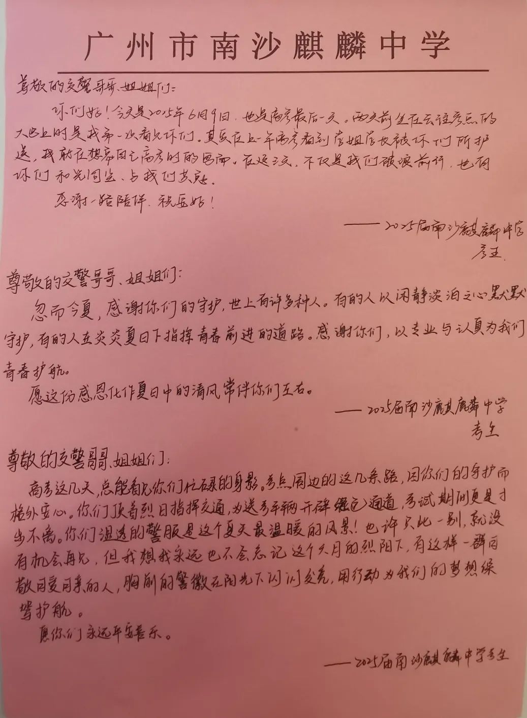6月9日上午,2025年高考最后一天,送考大巴在广州南沙公安护航下顺利到达广州市南沙区各个考点后,现场执勤民辅警接连收到来自广州市二中南沙天元学校、广州市外国语学校、南沙麒麟中学及广大附中南沙实验学校送来的共5封学校感谢信、100余封学生感谢信。薄薄的信纸上,是或娟秀,或洒脱,或工整,或刚劲的字迹,或长或短地书写着考生们这几天的所见所感。