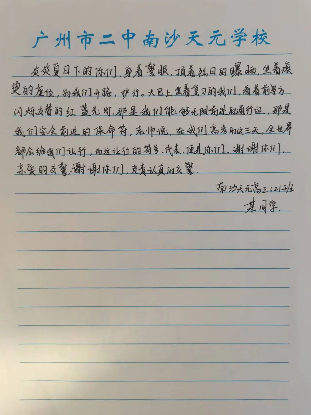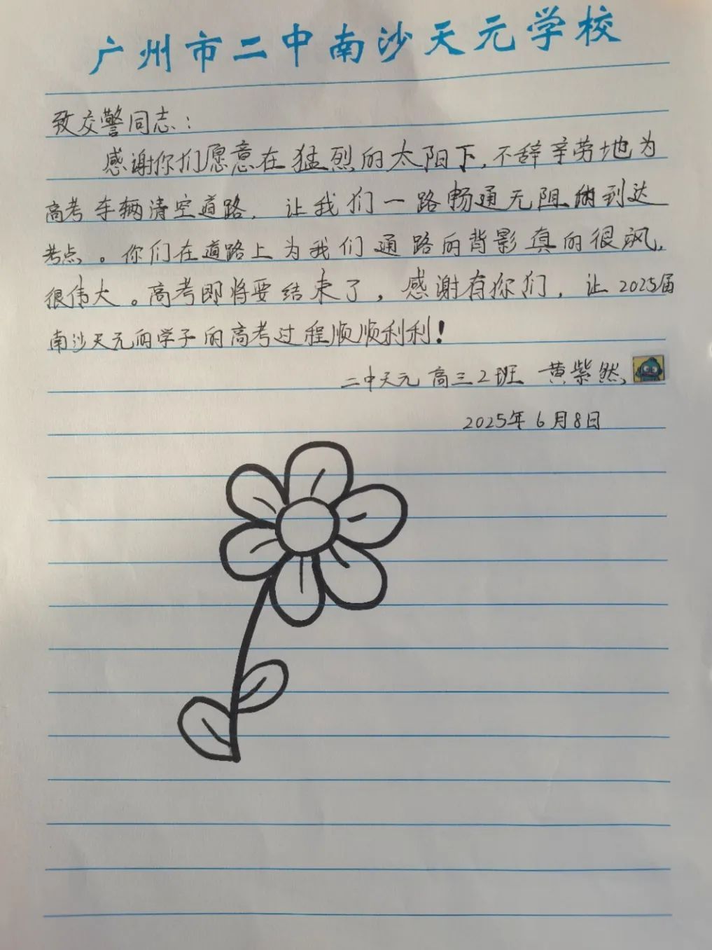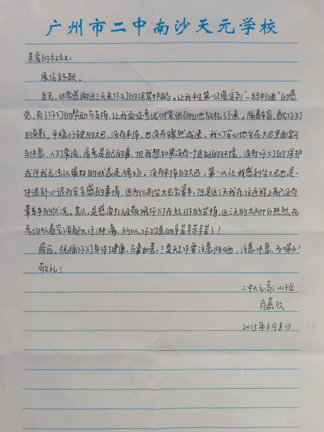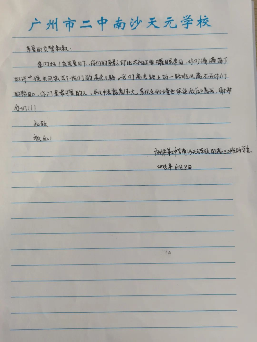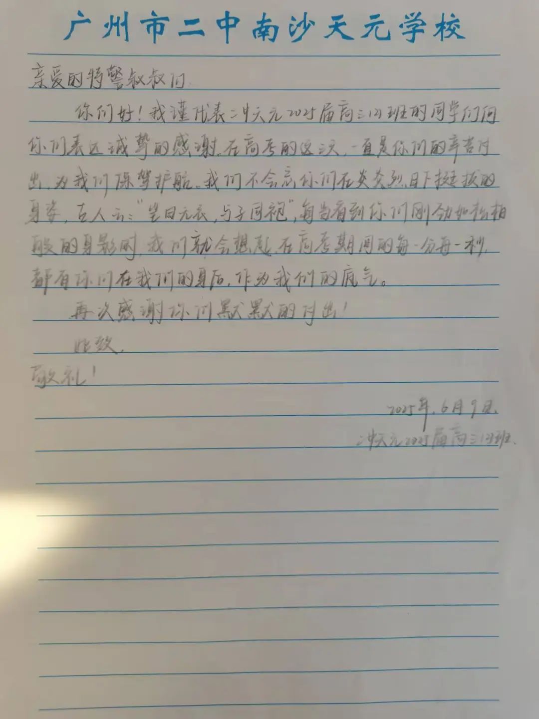 6月9日上午,2025年高考最后一天,送考大巴在广州南沙公安护航下顺利到达广州市南沙区各个考点后,现场执勤民辅警接连收到来自广州市二中南沙天元学校、广州市外国语学校、南沙麒麟中学及广大附中南沙实验学校送来的共5封学校感谢信、100余封学生感谢信。薄薄的信纸上,是或娟秀,或洒脱,或工整,或刚劲的字迹,或长或短地书写着考生们这几天的所见所感。