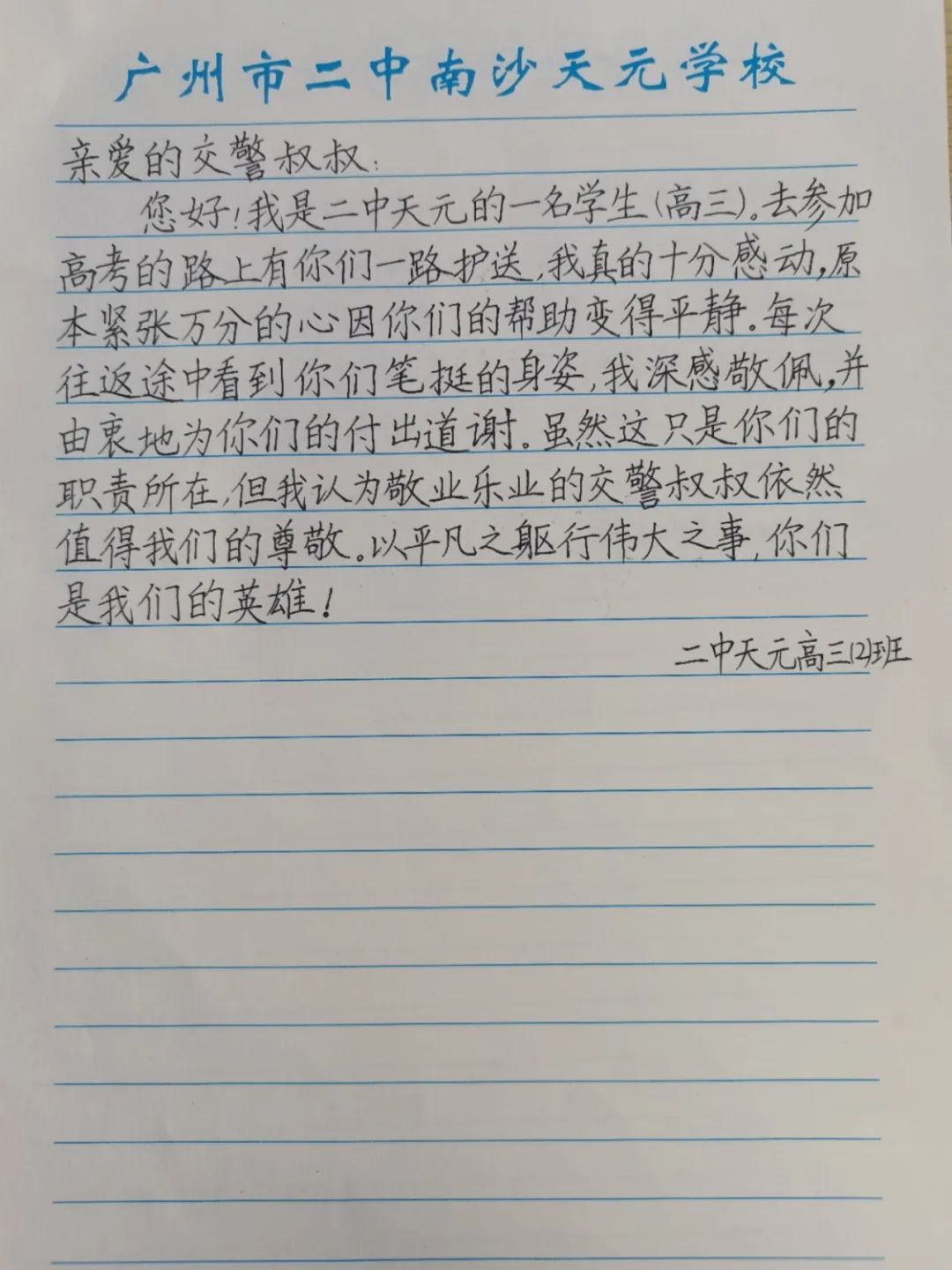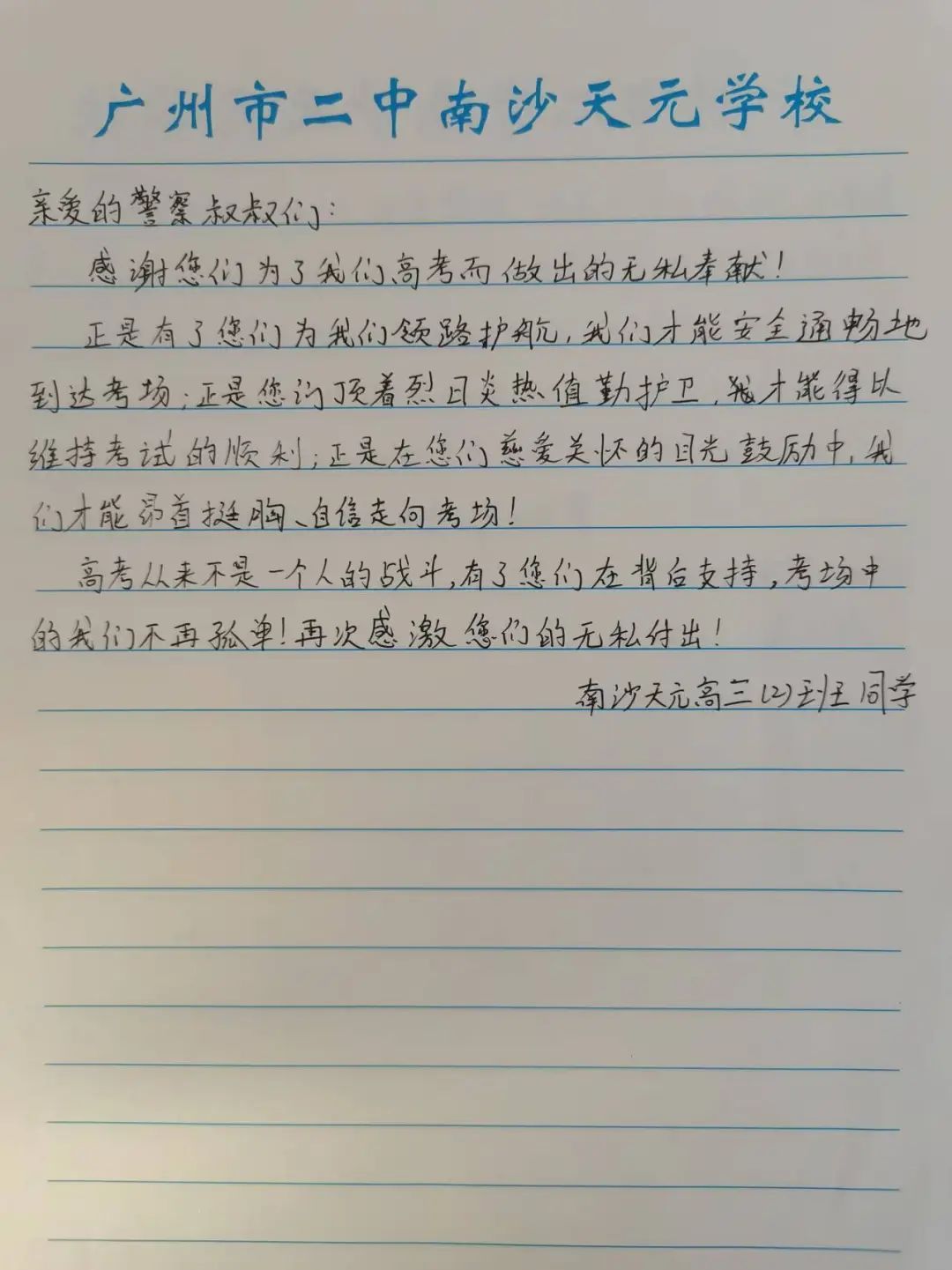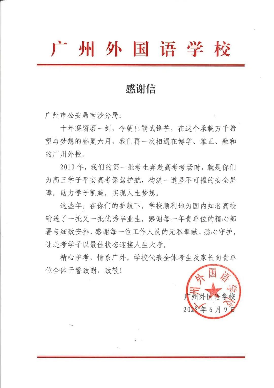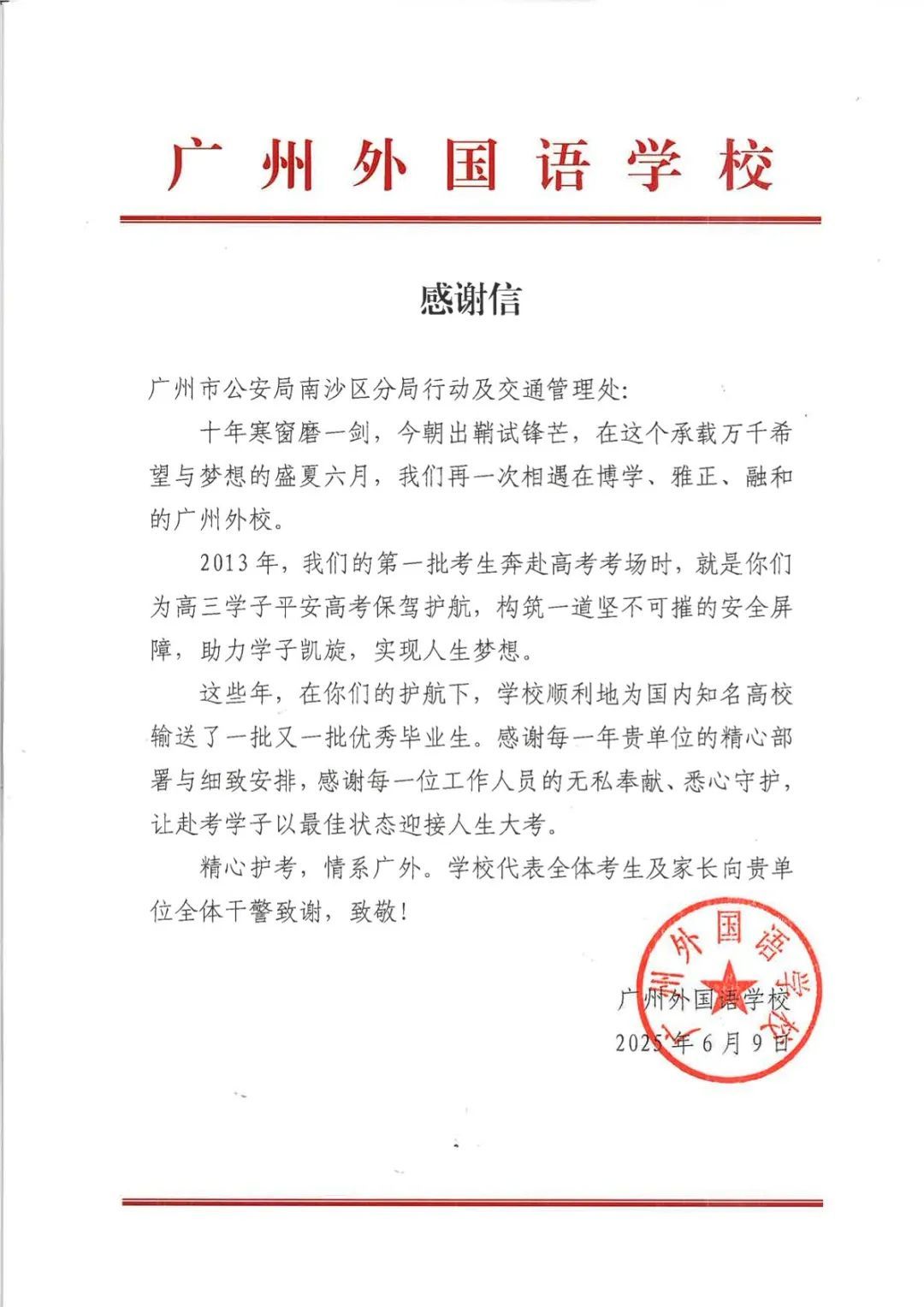 6月9日上午,2025年高考最后一天,送考大巴在广州南沙公安护航下顺利到达广州市南沙区各个考点后,现场执勤民辅警接连收到来自广州市二中南沙天元学校、广州市外国语学校、南沙麒麟中学及广大附中南沙实验学校送来的共5封学校感谢信、100余封学生感谢信。薄薄的信纸上,是或娟秀,或洒脱,或工整,或刚劲的字迹,或长或短地书写着考生们这几天的所见所感。
