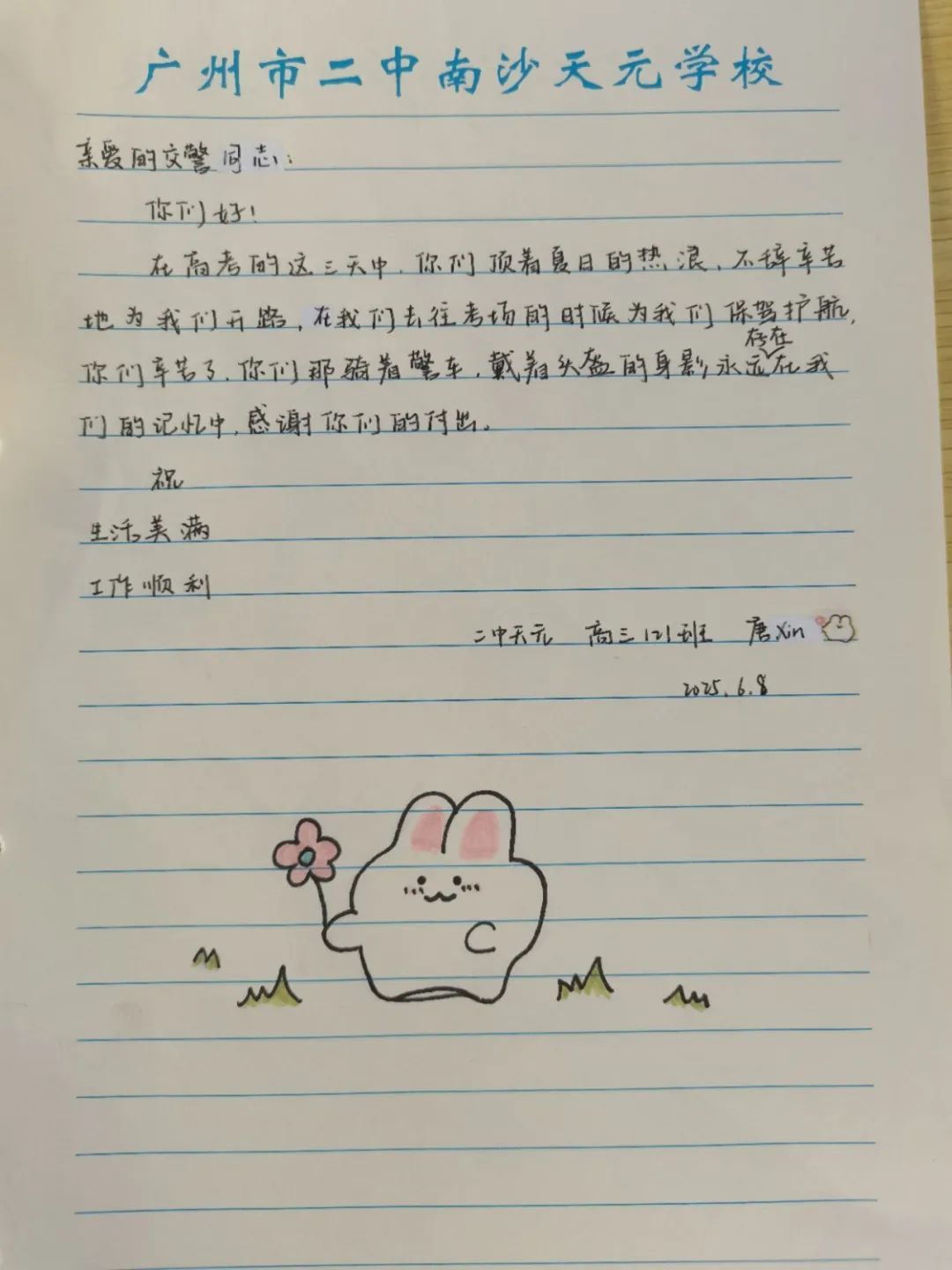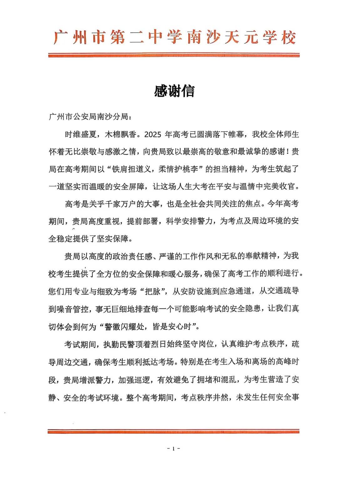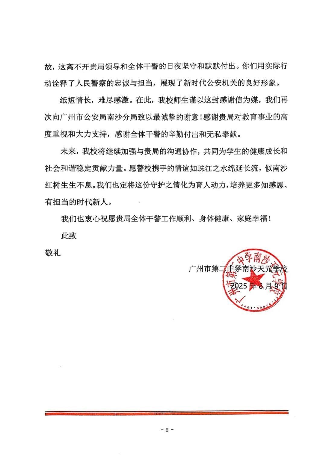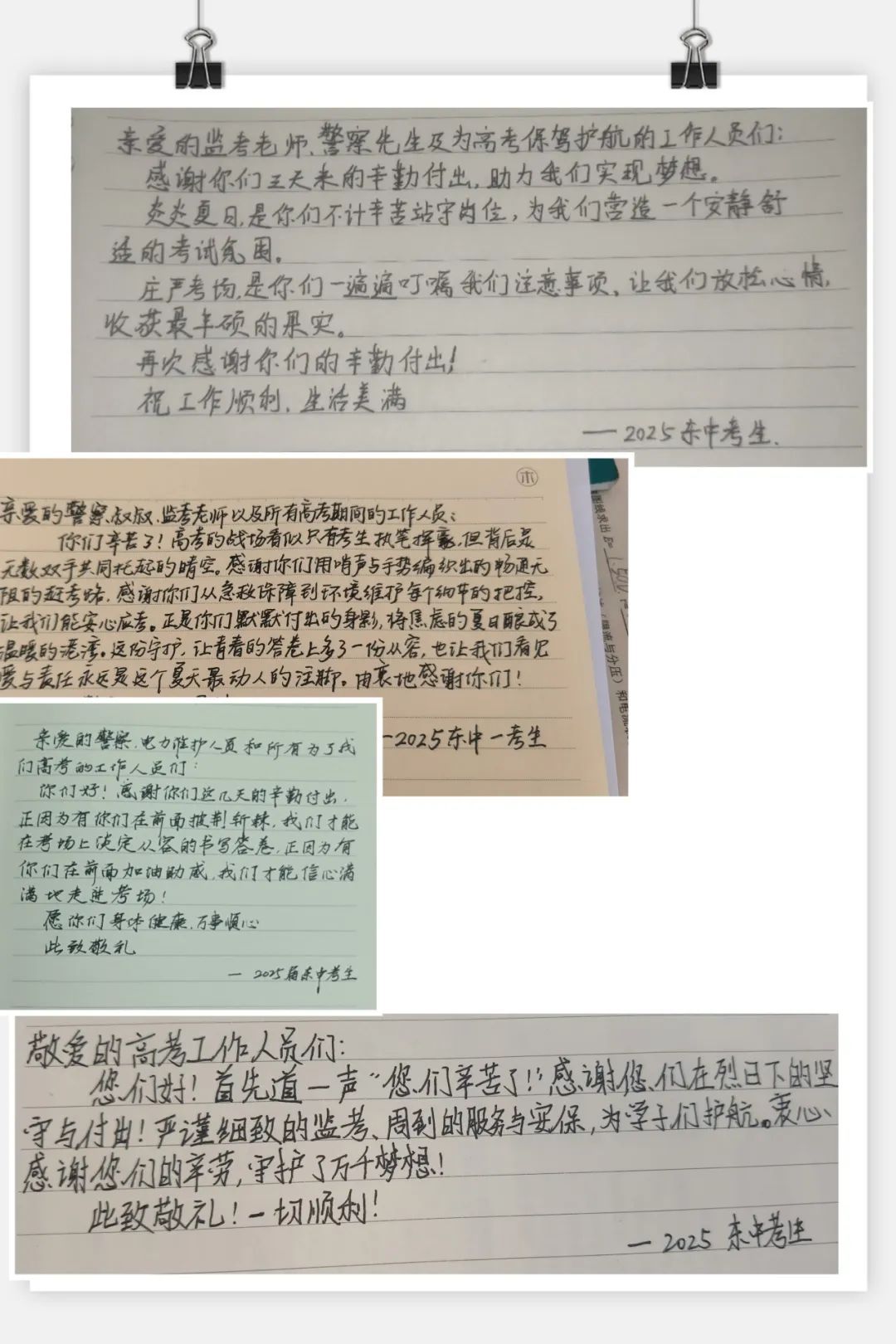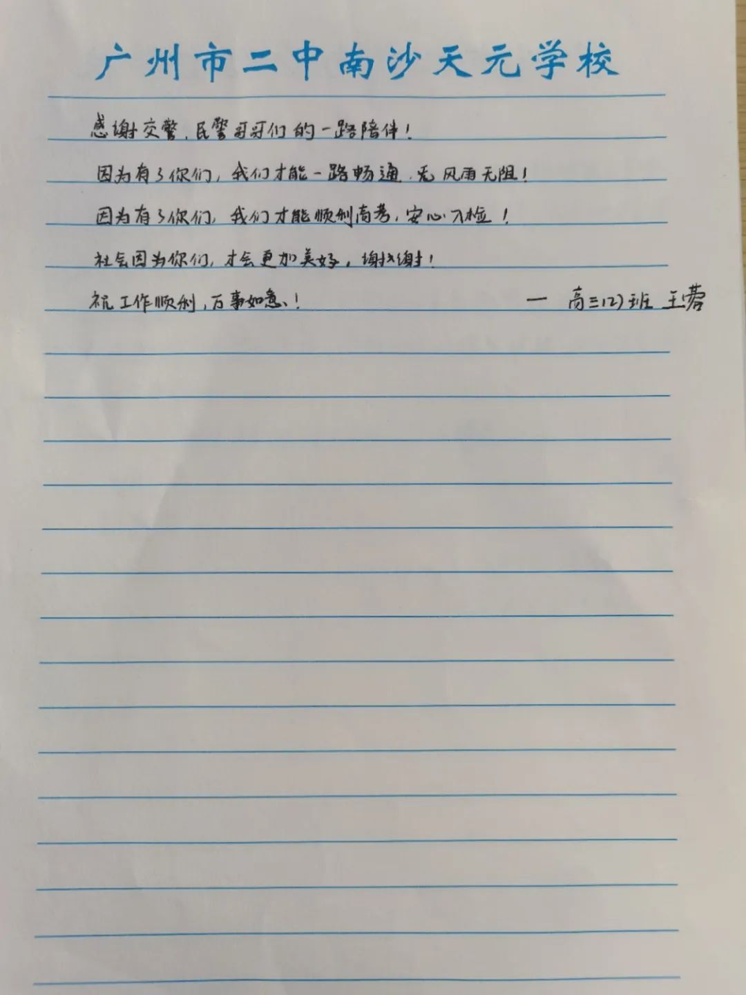 6月9日上午,2025年高考最后一天,送考大巴在广州南沙公安护航下顺利到达广州市南沙区各个考点后,现场执勤民辅警接连收到来自广州市二中南沙天元学校、广州市外国语学校、南沙麒麟中学及广大附中南沙实验学校送来的共5封学校感谢信、100余封学生感谢信。薄薄的信纸上,是或娟秀,或洒脱,或工整,或刚劲的字迹,或长或短地书写着考生们这几天的所见所感。
